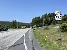 Pennsylvania Route 234 (PA 234) is a 38-mile-long (61 km) state highway located in Adams and York Counties in Pennsylvania. The western terminus is at U.S. Route 30 (US 30) in Franklin Township. The eastern terminus is at PA 462 in West York. PA 234 heads east from US 30 as a two-lane undivided road through rural areas in northern Adams County, passing through Arendtsville before it reaches Biglerville, where it intersects PA 394 and PA 34. The route continues east and has an interchange with the US 15 freeway in Heidlersburg and crosses PA 94 prior to reaching East Berlin, where it intersects PA 194. PA 234 crosses into York County and heads through rural areas in the western part of the county. Right before its eastern terminus at PA 462, PA 234 crosses US 30 on an overpass; however, there is no direct access to the highway. PA 234 was designated in 1928 between US 30 in Franklin Township and PA 194 in East Berlin. The route was extended east from East Berlin to US 30 (now PA 462) west of West York in 1937. The entire route was paved in the 1930s.