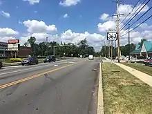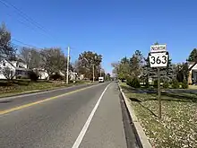The road passes through residential neighborhoods before entering commercial areas and crossing Sumneytown Pike. PA 363 heads to the southeast of North Penn High School and runs past a mix of homes and businesses as it gains a center left-turn lane on the approach to the Allentown Road junction. A short distance later, the route enters the borough of Lansdale and passes homes as a two-lane road. PA 363 reaches its northern terminus at an intersection with PA 63 (West Main Street) in Lansdale, where Valley Forge Road continues north as a local street.[3][4]
