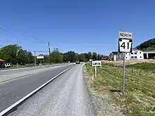 In 1928, PA 41 was rerouted at Lancaster to head southeast to the Delaware state line near Kaolin. The new alignment ran along US 222/PA 72 from Lancaster south and east to Lampeter, where PA 41 headed east through Strasburg to Gap. From Gap, PA 41 ran southeast along the Gap Newport Pike to the Delaware border. At this time, all of PA 41 was paved except for the portion between Strasburg and Gap. PA 240 replaced the PA 41 designation along the US 222 concurrency between Lancaster and Reading.[18] By 1930, the western terminus of PA 41 was cut back to US 222 near Lampeter, removing the concurrences with US 230 and US 222, while the road from PA 41 in Gap north to US 30 was designated as PA 741. By this time, the route was paved from a point east of Strasburg east to Gap.[19] The northern terminus of PA 41 was moved to its current location at US 30 by 1940, replacing PA 741. Meanwhile, PA 741 was designated onto the former alignment of PA 41 between US 222 near Lampeter and Gap.[20] In 1954, PA 41 was rerouted to bypass Atglen and Christiana to the northeast along its current alignment, having previously followed current Fallowfield Road, Main Street, Zion Hill Road, and Newport Avenue.[21][22][23][24][25] By 1959, PA 41 was realigned to the east of Cochranville, having previously passed through the community on current Cochran Street.[21][23]