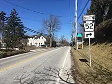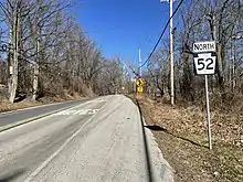 Pennsylvania Route 52 (PA 52) is a 11.8-mile-long (19.0 km) state highway located in southeast Pennsylvania. The southern terminus of the route is at the Pennsylvania-Delaware state line near Kennett Square, where the road continues as Delaware Route 52 (DE 52). The northern terminus is at U.S. Route 322 Business (US 322 Bus.) in West Chester. Near the Kennett Township community of Longwood, it has about a 1-mile (1.6 km) wrong-way concurrency with US 1. PA 52 passes through suburban and rural areas along its route.