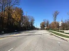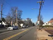 At this point, PA 63 heads into wooded residential areas as a two-lane road.[3] At the intersection with Edge Hill Road, the route turns southwest onto that road and fully enters Abington Township. Farther southwest, PA 63 makes a turn southeast onto Old Welsh Road. The road curves to the east and crosses into Lower Moreland Township.[4] The road becomes Welsh Road again and widens to four lanes as it enters a mix of residential and commercial establishments in the community of Huntingdon Valley, crossing the Pennypack Trail at the Terwood Road intersection and the Pennypack Creek. At the junction with Carson Terrace/Walton Road, there is a westbound jughandle for right turns and U-turns. Upon intersecting PA 232 (Huntingdon Pike) in the community of Bethayres, the route becomes Philmont Avenue and narrows back to two lanes. PA 63 turns south onto Red Lion Road and crosses SEPTA's West Trenton Line at-grade as it continues through wooded residential subdivisions, making a turn to the southeast and intersecting Pine Road before heading into the city of Philadelphia in Philadelphia County.[3][4]