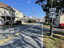 PA 895 begins at an intersection with PA 443 in the borough of Pine Grove in Schuylkill County, heading east on two-lane undivided East Wood Street. The road runs through residential areas and curves southeast, crossing the Swatara Creek into Pine Grove Township. The route becomes an unnamed road and continues past a few homes, turning east and intersecting the northern terminus of PA 501 in Marstown. PA 895 runs through a mix of farm fields and woods with some homes a short distance to the north of Lower Little Swatara Creek on Rock Road, crossing into Washington Township. The road continues through rural land, passing through the community of Rock. Farther east, the route enters Wayne Township and becomes Fair Road, passing through the community of Moyers. PA 895 heads through agricultural areas, briefly turning north before making a turn back to the east. The road comes to an intersection with PA 183 a short distance to the west of the community of Summit Station.[2][3]