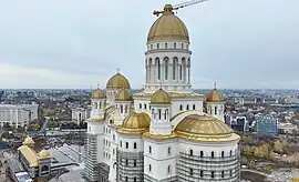 The People's Salvation Cathedral (Romanian: Catedrala Mântuirii Neamului), also known as the National Cathedral (Romanian: Catedrala Națională), is an Eastern Orthodox cathedral under construction in Bucharest to serve as the patriarchal cathedral of the Romanian Orthodox Church.[22] It is located in central Bucharest on Spirea's Hill (Arsenal Square), facing the same courtyard as the Palace of Parliament which is the heaviest building in the world,[23] the cathedral having a tenth of its weight and about 24% of its volume.[24] Situated behind the Palace of Parliament, this will make it 50 metres taller than the Palace, and will help to make the cathedral an iconic landmark in the city.[25] The People's Salvation Cathedral is 86.2 metres (283 ft) above sea level, and at 135 metres (443 ft) height (ground-cross), holds a dominant position in Bucharest's cityscape, being visible from all approaches to the city.[26][10]