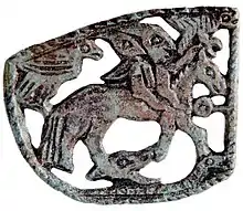 Researchers point to the influence of Scytho-Sarmatian animal style on the development of cult toreutics of the forests of the north: famous animal battle scenes, vertical model of the Universe in the form of three worlds – three levels of the plaques and the cult of the great mother-goddess are present in both styles. Perm animal style objects include metalwork of bronze with the usage of single- or double-sided forms for casting, bone and wooden carvings, engravings on metal and bone objects. Figures depicted on the images are elks, rain-deers, bears, fur-bearing and other types of animals, horses, different waterfowl and birds of prey, snakes, insects and a number of "complex creatures" of mixed nature (hybrids), mixed zoomorphic and anthropomorphic half-human creatures; there are also a number of images of horsemen. The stories, which the Perm animal style plaques tell, are numerous and diverse.The objects are found in the hoards, on the sites of the temples, among the skeletons, in burials, as part of sacrificial complexes or on the sites of metallurgical workshops. Most of the bronze artifacts were used as a cult figures for the sacred rites.[3]