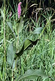 - P. a. var. emersa (longroot smartweed) – Plants palustrine, usually with emergent leafy stems; ocreae never with flared apices; aerial leaves petiolate with acuminate tips; inflorescence spikes terminal, usually 2 (unequal), > 4 cm long.[5]