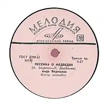 "Pesenka o medvedyakh" (Russian: Песенка о медведях, "A little song about bears") is a song written by Leonid Derbenyov and composed by Aleksandr Zatsepin for the 1966 Soviet film Kidnapping, Caucasian Style, in which it was sung by the main heroine (played by Natalya Varley and dubbed for the song by Aida Vedishcheva).[1][2]