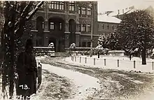 Kočić left Gomionica after two years and completed his primary education at the Eastern Orthodox religious school in Banja Luka, though he returned to the monastery every summer in order to spend time with his father. Kočić was the best student in his class at the religious school, and upon graduating in 1891, he departed for Sarajevo to attend high school at the First Sarajevo Gymnasium. During his first three years, he excelled in subjects such as mathematics, as well as Greek, Latin, German and Serbo-Croatian, which the Austro-Hungarians deemed the "language of the land" (zemaljski jezik), so as not to become entangled in local ethnolinguistic disputes. Kočić experienced a violent fit in his fourth year, swearing at a theology teacher and throwing a textbook at him over a poor grade. He was dismissed from the classroom and subjected to a monetary fine.[2] According to a classmate, the outburst changed Kočić, "turning him from an ambitious, disciplined student, into a truant and frequenter of kafanas and bars."[2] Following an incident in which a visibly intoxicated Kočić and his friends verbally abused Muslim students in a hotel bar, Kočić was expelled from the Gymnasium.[4][lower-alpha 1] He found himself unable to enroll into any of the high schools in Bosnia, having apparently drawn the ire of the Austro-Hungarian authorities.[2] Kočić was forced to continue his education in neighbouring Serbia and enrolled into a Belgrade high school, from which he graduated in 1899.[2]