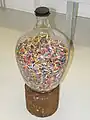 After the Postoj, Kalmus participated at many art exhibitions in Slovakia and abroad.[5] Kalmous considers creating art to be his lifestyle.[6] His work reflects the public obsession with consumerism as well politics, death, religion, sports.[7] He has several long-running projects, including the cycles Partitúry (Scores) and Korózne grafiky (Corrosive Prints). Perhaps his well-known long-term project has consisted of wrapping a wire around at least one stone every day between 1998 and 2022, representing the 70 000 Jews deported from Slovakia by the fascist Slovak Republic during the World War II.[3] A Peter Kalous' Holocaust monument, consisting of four glass tubes filled with the wire-wrapped stones, was first uncovered in 2016 by the President of Slovakia Andrej Kiska. It is located in a renovated synagogue in the town of Lučenec.[8]