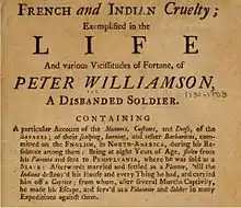 - French and Indian Cruelty, exemplified in the Life and various Vicissitudes of Fortune of Peter Williamson, who was carried off from Aberdeen in his Infancy and sold as a slave in Pennsylvania (York, 1757)