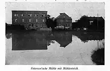 Franz Peterson rebuilt a modernized grain processing mill, fitted with a 51.5 kilowatts (69.1 hp) motor engine, a 25.8 kilowatts (34.6 hp) water turbine fed by a nearby 118 square feet (11.0 m2) pond. The mill daily produced 14 tons of grain. The facility operated till May 1951, when the State Grain department (Polish: Państwowe Zakłady Zbożowe) handed it to the local Peasant Cooperative in Bydgoszcz.[11]