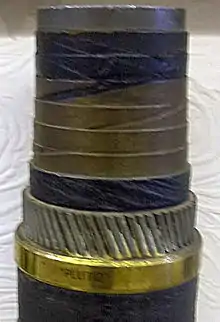 The Harvey flamethrower was introduced in August 1940, and was mostly made from readily available parts such as wheels from agricultural equipment manufacturers and commercially available compressed air cylinders.[95] It comprised a welded-steel cylinder containing 22 gallons (100 L) of creosote and a standard bottle of compressed nitrogen at 1,800 pounds per square inch (120 bar) mounted on a sack truck of the type that a railway-station porter might use. About 25 ft (7.6 m) of armoured hose provided the connection to a four-foot-long (1.2 m) lance with a nozzle and some paraffin-soaked cotton waste that was set alight to provide a source of ignition. In operation, the pressure in the fuel container was raised to about 100 psi (6.9 bar), causing a cork in the nozzle to be ejected followed by a jet of fuel lasting about 10 seconds at a range up to 60 ft (18 m).[96] Like the Home Guard flamethrower, it was intended as an ambush weapon, but in this case the operator was able to direct the flames by moving the lance which would be pushed through a hole in otherwise bulletproof cover such as a brick wall.[97][95][98][99]