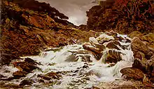It was during the 1890s that van der Velden discovered Otira Gorge on the West Coast,[1] which provided him with his most successful and enduring subject.[5] The first trip took place in January–February 1891 and the primary work produced was Waterfall in the Otira (aka Mountain Stream) (1891).[6] Van der Velden treated the Otira landscape as an opportunity to evoke the sublime, and sought out appropriate opportunities to depict it; as a student of his later recalled: