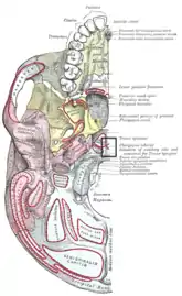 ![]() Base of skull. Inferior surface. (Pharyngeal tubercle labeled at right, eighth from the bottom.) | |