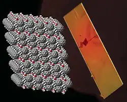 ![]() PCBM crystal and its model. Gray: carbons, red: oxygens, white: hydrogens. | |