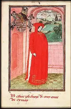 When Charles the Bold came to power in 1465, he banished Philip, as well as his father Jean II and his uncle Antoine I de Croÿ. Philip was the first to reconcile with Charles in 1468.[3] In 1471, he led an embassy to Ferdinand I of Naples and Pope Sixtus IV.[3]