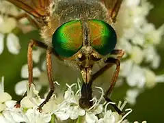 The adult females grow up to 18 millimetres (0.71 in) long. Their large compound eyes are bright green, without hairs and ocular bands. The terminal of antennae is brownish-black. The thorax is dark-brown and quite hairy. The abdomen has clearer bands at the end of each black tergite. Wings and legs are yellowish-brown. Halteres are brownish-yellow.[8][9]