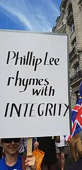 Lee was opposed to Brexit prior to the 2016 referendum.[32] He resigned as a minister on 12 June 2018. In a widely reported resignation statement, he said that his reason was so he could "better speak up for my constituents and country over how Brexit is currently being delivered". He went on to warn that the current approach to Brexit would damage businesses in his constituency, and that he could not support the government's opposition to Parliament deciding what happens if it rejects the final deal "because doing so breaches such fundamental principles of human rights and Parliamentary sovereignty".[1] In early 2019 he became chair of Right to Vote,[33] having already joined the People's Vote campaign for a public vote on the final Brexit deal between the UK and the European Union.[34] On 1 June 2019 Lee's local Conservative Association passed a motion of no confidence in Lee, due to clashes over Lee's stance on Brexit.[35]