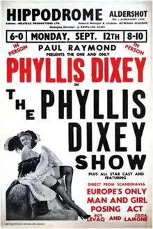 Phyllis Dixey (10 February 1914 – 2 June 1964) was an English singer, actress, dancer and impresario. Her earlier career was as a singer in variety shows in Britain. During World War II, she joined ENSA and entertained the British forces. She sang, recited and posed in naked tableaux which were very popular.