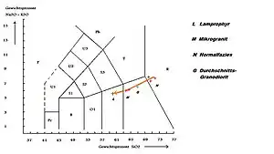 Modally the rocks of the massif plot as granodiorite in the QAPF diagram yet are in close vicinity of the granite field. Chemically they are granites; to be more precise they are adamellites. Likewise in the TAS diagram they plot as rhyolites.
