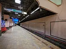 M1 platform of Piața Victoriei metro station showing the tactile paving for visually impaired pedestrians.