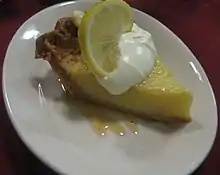 Shaker lemon pie is a four-ingredient pie that originated in the Shaker communities of the Midwestern United States. To make this pie, lemon slices and sugar are placed in a bowl for several hours until the lemons are juicy, then eggs are beaten in and the mixture is poured into a pastry-lined pie dish. After it is baked, the pie can be served with ice cream, either warm or at room temperature.[50]