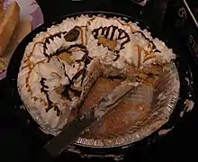 Mud pie is a type of pie with many variations that can be made at home but is also a common dessert at American restaurants. One of the simplest no-bake versions is made with only four ingredients, mocha or coffee ice cream in a chocolate cookie crumb crust with a generous topping of whipped cream and warm fudge sauce. Sometimes coffee liquor or Kahlua is added, or cookies mixed in, and some versions made with eggs are baked like other custard pies.[70] Often associated with the cuisine of the Deep South, especially Mississippi, the mud pie can be found in other regions of the country as well. The name is said to come from the effect created by hot fudge sauce melting the ice cream as it is poured over individual slices of pie.[71]