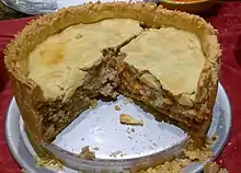 Tourtière is a French-Canadian meat pie, usually prepared for the Christmas Réveillon meal. Although its roots may lie in Medieval cuisine, the story of how the pie arrives in New England remains a matter of dispute. Some say that meat pies first arrived in Canada in the 17th century, others say the particular form of the dish made with potatoes, fragrant spices like cloves and cinnamon, and game birds and animals evolved in Quebec.[57] It arrived in New England with French-Canadian immigrants, who made up nearly one-tenth of New England's population by 1900. It has become a symbol of regional French-Canadian identity that has survived assimilation and language loss. In the United States the fragrant spices are toned down, and cloves often replaced by allspice, which is the most common spice in American versions of the pie.[58] There are many regional variations of the basic mince and potato pie.[59]