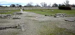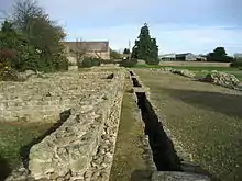 Visible Roman remains at the eastern part of the site include parts of the east gate and wall defences, a courtyard building and an internal road, and a section of the eastern elevation is now preserved and on permanent public display.[7] The original rectangular defence pits are lawned over between the wall and the outer ditch.[29][30] There were obstacle pits,[31] and also man-traps or camouflaged holes spiked with large, pointed, wooden stakes for unsuspecting attackers to fall into. These were roughly square holes, probably originally covered with undergrowth.[1]