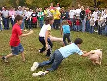 Pig wrestling (also known as pig scramble[1] and with the variants hog wrestling and greased pig catching) is a game sometimes played at agricultural shows such as state and county fairs, in which contestants, try to hold onto a pig. In the most common version, a team of four members chases a domestic pig around a fenced-off mud pit and attempts to place it in a barrel, in a race against the clock.[2] In some events the pigs are greased with lard (pig fat), vegetable or mineral oil in order to make catching the pig even more difficult.[3]