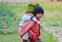 A person carrying someone else on their back is most commonly seen in the modern day in the form of a parent carrying an underage child, either for travelling or for children's games. It can involve the carrier crawling on hands and knees with the child straddling over the back like riding a horse, or with the carrier standing upright with the child hugging or cradled behind the back, often with the child's arms leaning over the carrier's shoulders and legs wrapping around the flanks.
