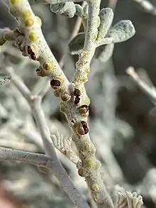 It is a tiny parasitic plant, only a few millimeters long, which lives in the stem tissues of its host plants, species of legume shrubs, often of genus Psorothamnus, especially Emory's indigo bush or dyebush (Psorothamnus emoryi). It has no roots, leaves, or chlorophyll, obtaining its water and nutrients from the host.[5] It grows as microscopic strands similar to fungal filaments completely within the stems of its host, until when it blooms, sending tiny flowers through the surface of the host plant.[6]
