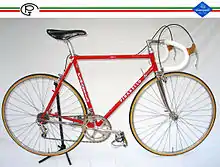 The Pinarello Montello SLX was a landmark model for Pinarello as this was the frame with which Pinarello achieved their first major pro victories. This model frame was one of the most responsive of the mid to late 1980s as shown by wins in events such as the 1984 Summer Olympics Road Race, Vuelta a España, the Giro d'Italia and stages of the Tour de France.[10] The Montello had a brake cable through the top tube, chrome sloping front fork and chrome on the drive side chain stay; later models had the full rear triangle chromed. The Montello SLX was in red, blue and Spumoni.[11] Pinarellos from the mid-1980s often have the decals restored by owners as factory-applied decals where prone to flaking off.[12] The Montello was fabricated from Columbus SLX butted tubing with rifling down the inside center. The bottom bracket was investment cast with the Pinarello logo and the dropouts were by Campagnolo. Braze-ons for down-tube shifters, front derailleur and two water bottles were provided. The GPT logo (for Giovanni Pinarello, Treviso) appeared in many locations.