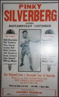 Pinky Silverberg (April 5, 1904 – January 16, 1964) was a Connecticut-based American boxer who briefly held the National Boxing Association (NBA) World Flyweight title in late 1927. With an efficient defense, Silverberg was knocked out only once in his career by Willie LaMorte in 1926. His managers were Johnny Herman, Lou Anger, and Joe Smith. Problems with his hands, which were often broken during his career, may have hampered many of his boxing performances.[1][2][3]