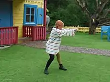Pippi Longstocking is a nine-year-old girl.[2] At the start of the first novel, she moves into Villa Villekulla: the house she shares with her monkey, named Mr. Nilsson, and her horse that is not named in the novels but called Lilla Gubben (Little Old Man) in the movies.[3] Pippi soon befriends the two children living next door, Tommy and Annika Settergren.[4][5] With her suitcase of gold coins, Pippi maintains an independent lifestyle without her parents: her mother died soon after her birth; her father, Captain Ephraim Longstocking, goes missing at sea, ultimately turning up as king of a South Sea island.[6][7] Despite periodic attempts by village authorities to make her conform to cultural expectations of what a child's life should be, Pippi happily lives free from social conventions.[8][9] According to Eva-Maria Metcalf, Pippi "loves her freckles and her tattered clothes; she makes not the slightest attempt to suppress her wild imagination, or to adopt good manners."[9] Pippi also has a penchant for storytelling, which often takes the form of tall tales.[10]