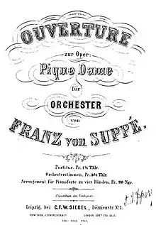 According to Robert Letellier in his 2013 introduction to Franz von Suppé: Overtures and Preludes, the enduring popularity the work's overture as a concert piece for orchestras stems from its "varied and vivid melodies", beautiful flute solo, and themes which "leap" between the higher and lower instruments of the orchestra.[6] The original orchestral score for the overture has been adapted for piano four hands by Theodor Herbert (1822–1891) and for solo piano by Clemens Schultze-Biesantz (1876–1935).[10] It was also adapted for the mechanical organ by the Aeolian Company who described the piece in their 1919 catalog: