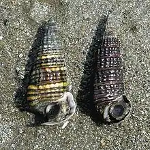 Comparison of live individual of Pirenella cingulata on the left, with Pirenella incisa on the right.