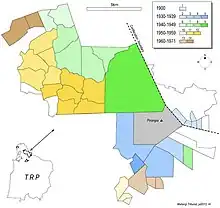 Prior to colonisation Ngāti Apakura, Ngāti Hikairo and Ngāti Māhanga occupied most of the current area of the Forest Park. A small area to the north east (see map of lands) was included in the 1865 confiscation area.[3] That boundary now largely defines the area remaining as bush.[4] The remaining area remained in Māori ownership until the summit area was bought in 1900 and further purchases and donations were added to the area until the Park was declared in 1971.[3] The Public Reserves, Domains, and National Parks Act, 1928[5] allowed the Pirongia and Wainui Domain Boards to buy land in 1932.[6] A scenic reservation of 2,183 acres (883 ha), including 1,700 acres (690 ha) purchased with help from the Bruce Trustees, was declared in 1937.[7] Later additions to the Park were Karioi in 1976 (after which the area was 14,306 ha (35,350 acres)) and Tapuwaeohounuku (also proposed to be named Te Rauamoa Block and formerly State Forest 56, of about 7,462 acres (3,020 ha)), on either side of Kaimango Rd, in 1984.[3]