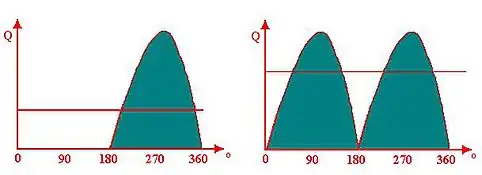 The piston in a plunger and piston pump does not move at a constant velocity and as a result of this the pressure and delivery fluctuate over the duration of the stroke. The following diagram shows the relation between the angle of the crankshaft and the delivery rate of a single-acting and double-acting pump. The line shows the average delivery rate of the pump. These fluctuations in pressure and delivery can cause undesired effects such as water hammer and thus are generally mitigated by the installation of an air-filled accumulator. The delivery can be further smoothed out by the use of multiple cylinders that are offset from one another.