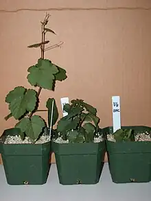 The Pixie Grape is a new type of Vitis vinifera cultivar. The Pixie is a natural dwarf grapevine that is derived from the periclinal L1/L2 chimera Pinot Meunier. These dwarf grapevines tend to have short internodes and prefer to grow flowers instead of tendrils. They grow from 1 foot to 2 feet in height and produce clusters with a size on average of 4 inches. It is simple to cultivate in greenhouses and grows year round. Its purpose was to create an easy tool with which to conduct grapevine research. The grape was developed by grape rootstock breeder Dr. Peter Cousins of the USDA and David Tricoli of the Plant Transformation Facility, University of California Davis.