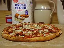 American pizza (particularly thin-crust) is made with a very high-gluten flour (often 13–14% protein content) of the type also used to make bagels; this allows the dough to be stretched thinly and thrown vigorously without tearing. Unlike Italian pizza,[12] American pizza often has vegetable oil or shortening mixed into the dough. This can range from a small amount in relatively lean doughs, such as New York–style, to a very large amount in some recipes for Chicago-style deep-dish dough.
