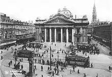 The Place de la Bourse was laid out following the covering of the river Senne (1867–1871), as part of the major urban works by the architect Léon Suys under the tenure of the then-mayor of the City of Brussels, Jules Anspach.[2][3] Centrally located halfway down the Boulevard Anspach/Anspachlaan (then called the Boulevard Central/Centraallaan), it served as the focal point of Suys' sanitation and beautification programme for the city.[4] The development work on the entire district began in 1868 and the Brussels Stock Exchange building was inaugurated in 1873.[5][6]