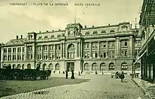 On the western side of the square, a new mint, built in 1649, then rebuilt and extended in 1755, gave way in 1820 to another mint designed in neoclassical style by the architect Charles Vander Straeten. Demolished in 1881–1886, it was in turn replaced in 1892 by the Grand Central Post Office (French: Poste centrale, Dutch: Hoofdpostkantoor), officially the Hôtel des Postes et Télégraphes, an imposing eclectic building by the architect Louis De Curte.[6]