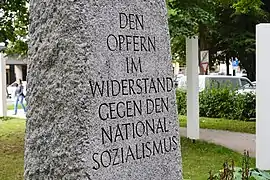 40 years after the end of the war, a granite memorial stone designed by Karl Oppenrieder and dedicated to "The victims in the resistance against National Socialism" was erected on this site.[3] In 1962, it was initially erected as a temporary measure on the Platz der Opfer des Nationalsozialismus (Place for the victims of National Socialism). After a stele with an eternal light was erected there, the stone came here in 1985.[4] The artist Wolfram P. Kastner planned to erect another monument on the square. Around the square he wants to place names, portraits and life stories of people who rebelled against the Nazi regime on a "yellow ribbon of remembrance".[5][6] It was opened in July 2016[7] and will probably be preserved until 2019.[1][2]