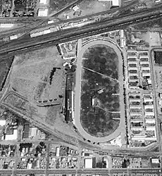 ![]() Aerial view in 1995: parking lot, grandstand, track, and barns | |