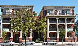 Built in 1909, this historic structure consists of three, four-story, brick and stone buildings that were designed in the Colonial Revival style. The complex is arranged in a "U"-shape, with two narrow courtyards. The primary facade features two three-story wooden porches, with Corinthian order columns and balconies on top.[2]