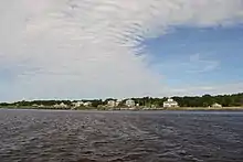 The combined island now stretches from Carolina Beach Inlet in the north, the Cape Fear River to the west, Onslow Bay (Atlantic Ocean) to the east and Long Bay (Atlantic Ocean) to the south. It is 17 miles long, 2 miles wide in the far north, 3 miles wide at the far south and about ½ mile wide in the middle. On the southeastern tip of the combined island lies "the point", or headland, known as Cape Fear. The shallow and treacherous Frying Pan Shoals jut 30 miles into the Atlantic Ocean southeasterly from the point. The shoal (or sandbar) is formed by the intersection of the longshore currents of Onslow Bay and Long Bay as well as the discharge from the Cape Fear River.[1]