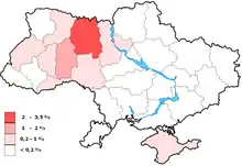 The number of Poles in Ukraine declined after Ukraine's independence, with a total number of 144,130 counted in the census of 2001. Most Poles who remained in Ukraine were and are concentrated in Zhytomyr Oblast (about 49,000), Khmelnytskyi Oblast (about 20,000), and Lviv Oblast (about 19,000). However, the official 2001 census numbers are highly controversial and questioned by many (for example, the Union of Poles in Ukraine, Roman Catholic Church in Ukraine and even Polish Consulate General in Lviv[4]) who allege that the real number of Poles and Polish descendants living in Ukraine is up to 2 million people.[2][3]