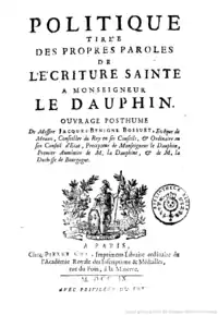 Politique tirée des propres paroles de l'Écriture sainte (English Politics Drawn from the Very Words of Holy Scripture) is a work of political theory composed by Jacques-Bénigne Bossuet as part of his duties as tutor for Louis XIV's heir apparent, Louis, le Grand Dauphin. It is one of the purest expressions of the branch of political absolutism which political scientists have labeled the divine right of kings.