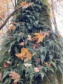 The plant prefers moist environments, so it is typically found on wet ground, rocks, moss-covered tree trunks in very wet areas, and logs. Occasionally it can be seen on fallen trees. It is particularly associated with bigleaf maple (Acer macrophyllum).[3][4] The fern is mycorrhizal, meaning it can form root associations with the hyphae of fungi.[5] It takes advantage of the mild, wet winters and the substrate of deciduous trees to photosynthesize and grow during the cold season when most other temperate plants are dormant. Habitat elevation is lowlands below 600 meters.[6]