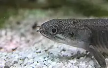 Polypterus senegalus, the Senegal bichir, gray bichir or Cuvier's bichir, and sometimes called the "dinosaur eel" (a misnomer, as the creature is neither an eel nor a dinosaur), "dinosaur bichir", or "dragon fish" is in the pet trade due to its lungfish-like appearance, which was described as more primitive and prehistoric than other modern fishes. It is a prototypical species of fish in the genus Polypterus, meaning most of its features are held across the genus. It is commonly kept in captivity by hobbyists. They are native from Africa where they are the most widespread species of the genus.[4][5][6][7][8]